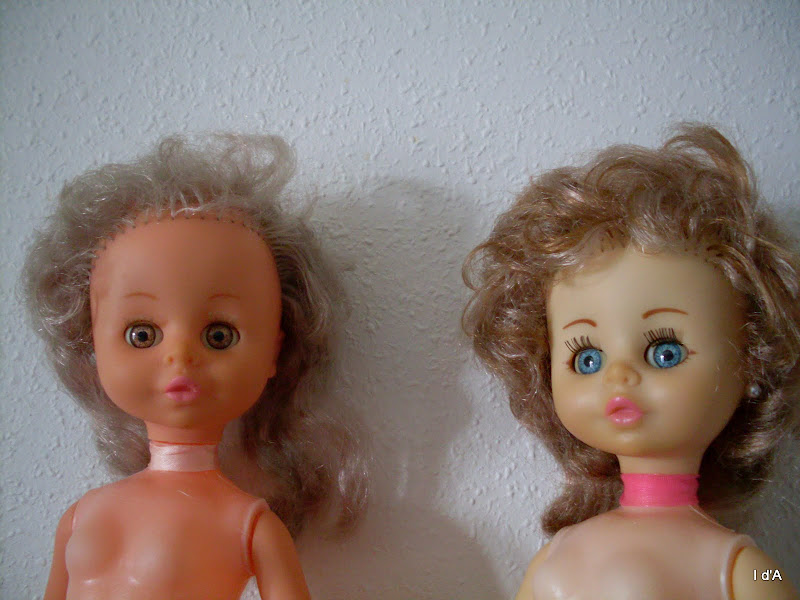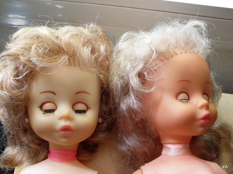 Celle de gauche perd beaucoup de cheveux, mais on a l'impression que seules deux mèches sont longues, comme pour etre ramener vers l'avant, un peu comme les poupées portant des chapeaux maintenus par des rubans noués sous le cou... Ces cils sont clairs comme ses cheveux.