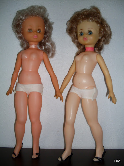 << Ce sont toutes deux des poupées mannequins de 45 cm, au corps assez mature et à la tête assez juvénile, mais qui fait penser à celle des poupées des années 70 ou 80. Fait étrange, leurs bras sont dans le même matériaux souple que la tête et non en plastique, comme le reste du corps.
